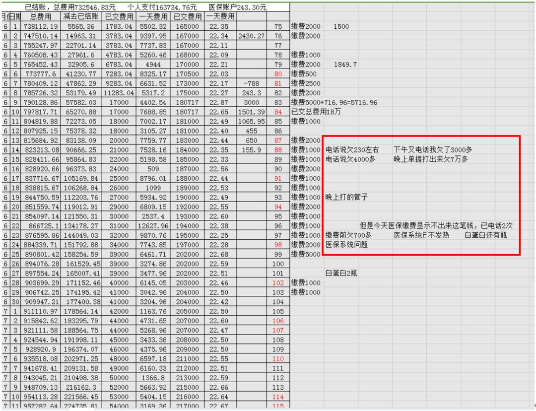 我姑媽是一名老會計,負責每天往醫院賬上交費。她每次交完費用,會讓ICU的護士打一個單子,看看上面的費用結余。累積了數十張單子之后,姑媽做了一個Excel表,根據國家醫保目錄和蕪湖市醫保支付的有關政策,推算出每天需要自費的大致比例。