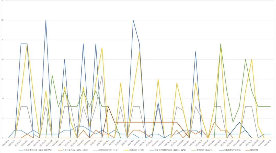 通過趨勢圖,我可以迅速發現波動異常的治療項目及關聯項目,都不用做回歸分析。其中,波動比較大的項目有血透、抗生素等。